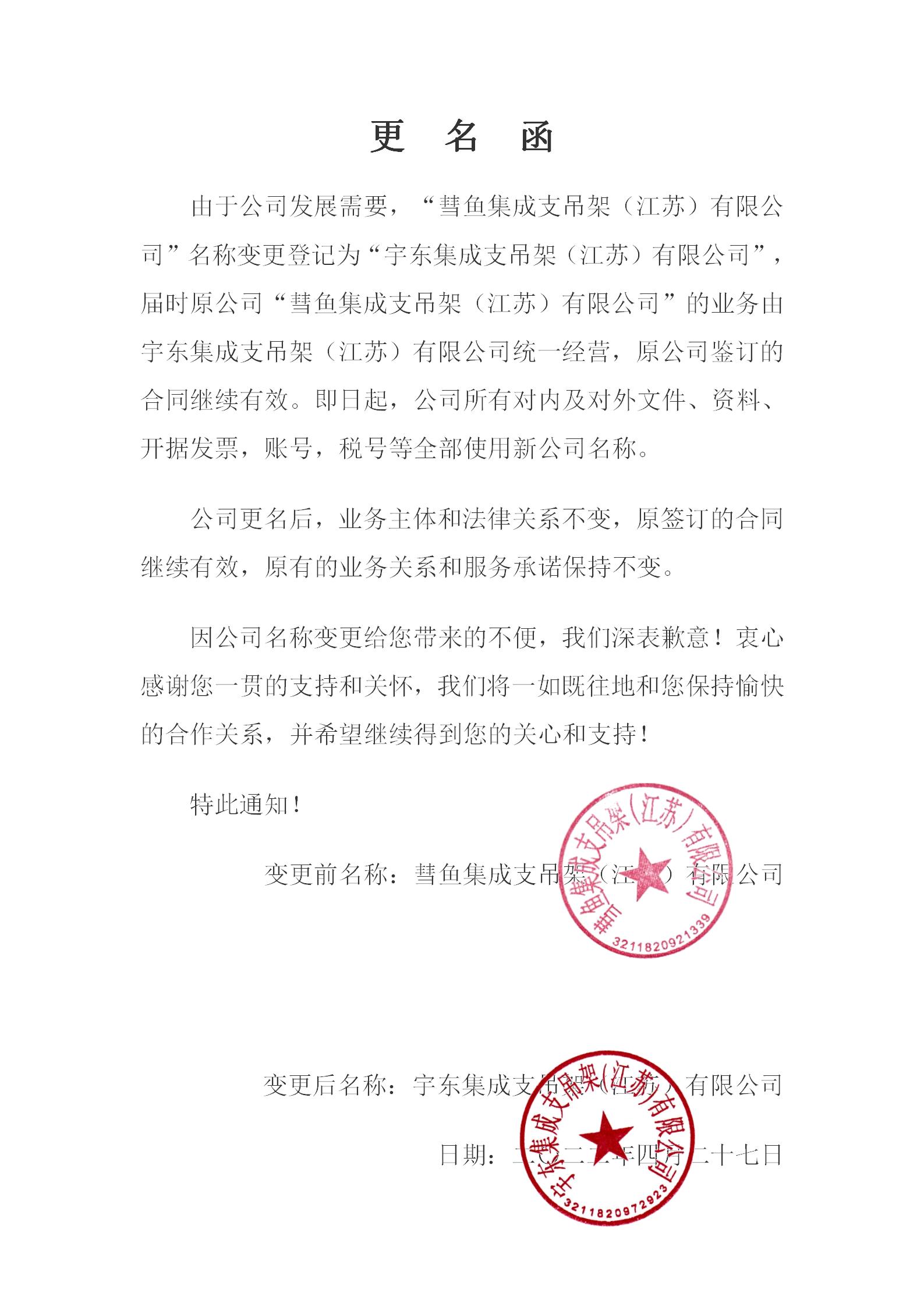 更名函:“慧鱼集成支吊架”变更“头号玩家官网登录入口集成支吊架”